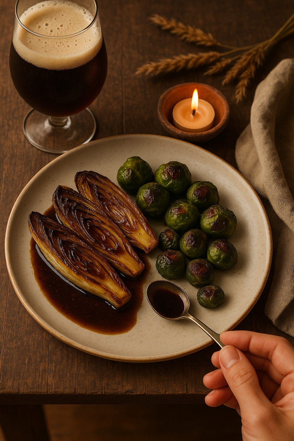 一盤烤菊苣搭配少量深色啤酒與一匙列日糖漿上釉,旁邊放幾顆褐邊抱子甘藍,就像把小酒館搬回家。從根莖的泥土氣到麥芽的圓潤甜,味道層次清楚得像初霜後的空氣。
