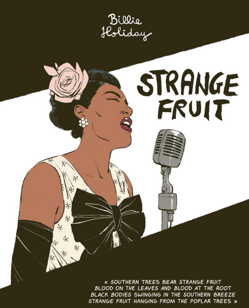 開場曲是比莉·哈樂黛的〈Strange Fruit〉。那首被唱片公司拒絕、卻最終被寫入音樂史的歌——她唱著美國南方的種族暴力:「樹上吊著奇異的果實」,那是黑人的屍體。