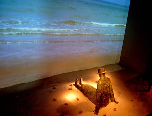 平靜的手法,卻令人眼眶濕潤,因為他從來不說大道理,卻重重敲擊你心中那扇未關好的門。例如他有一個結合機械自動化與光影的雕塑作品叫做《槓桿平衡》,一位戴著帽子、穿著長大衣的男人,在星空下賣力的爬上天梯,爬到頂端時男人一手托起了自己,梯子轉了360度迴旋,然後他坐在天梯上觀賞星星,看到這一幕,我的鼻子有種莫名的酸楚感,旅人的孤寂與自我調適,只有旅人可以真正體會。